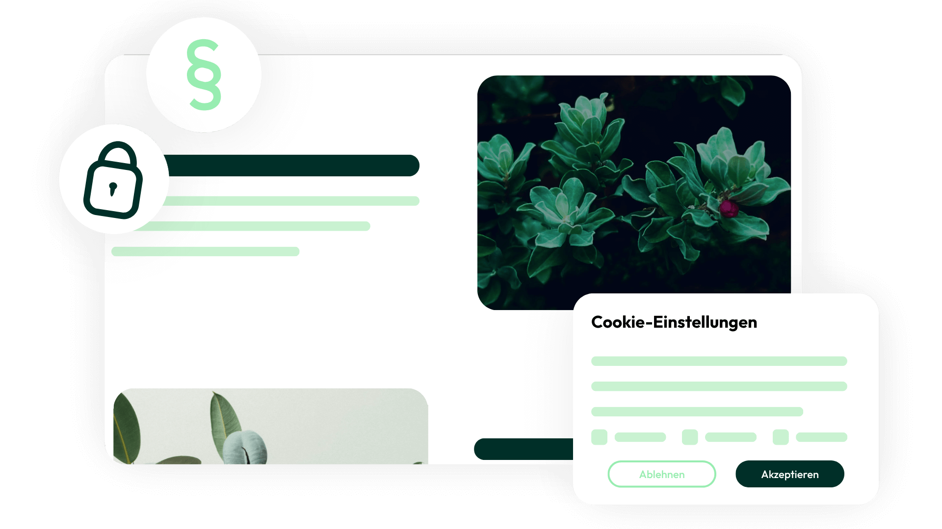 Rechtliche Updates Bei Gesetzesänderungen passen wir deine Rechtstexte (Impressum und Datenschutzerklärung) und dein DSGVO-Cookie-Management automatisch für dich an. So musst du dir keine Sorgen machen und kannst dich auf dein Business konzentrieren. | ||||